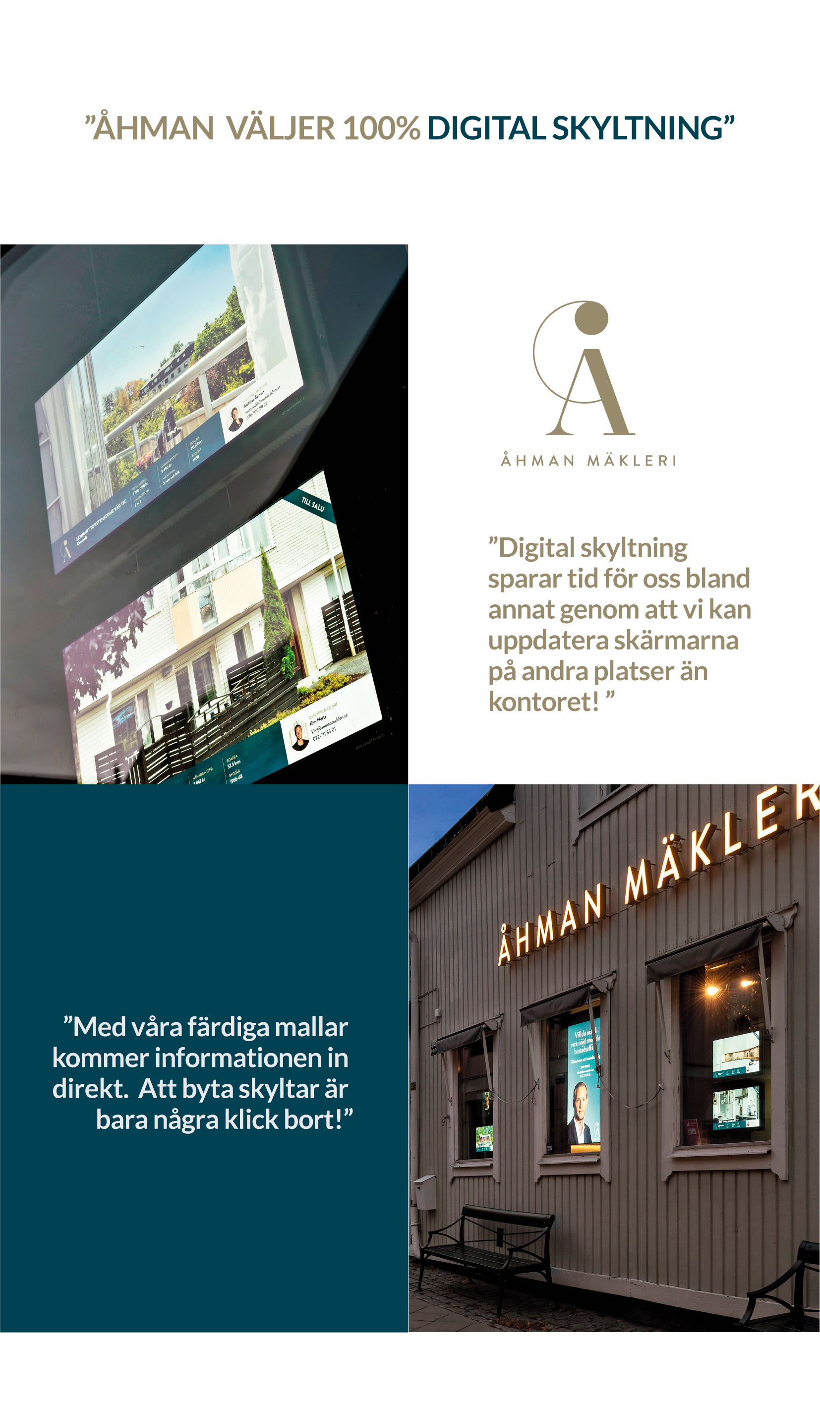 Mattias Åhman säger följande om fördelarna med digital butiksskyltning; "Våra skyltar är mycket bättre uppdaterade än dom var tidigare! De sålda objekten försvinner snabbt och nya publicerade objekt kommer upp direkt bara efter några knapptryckningar.