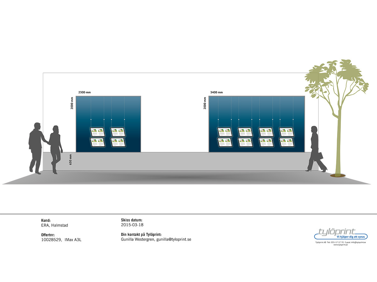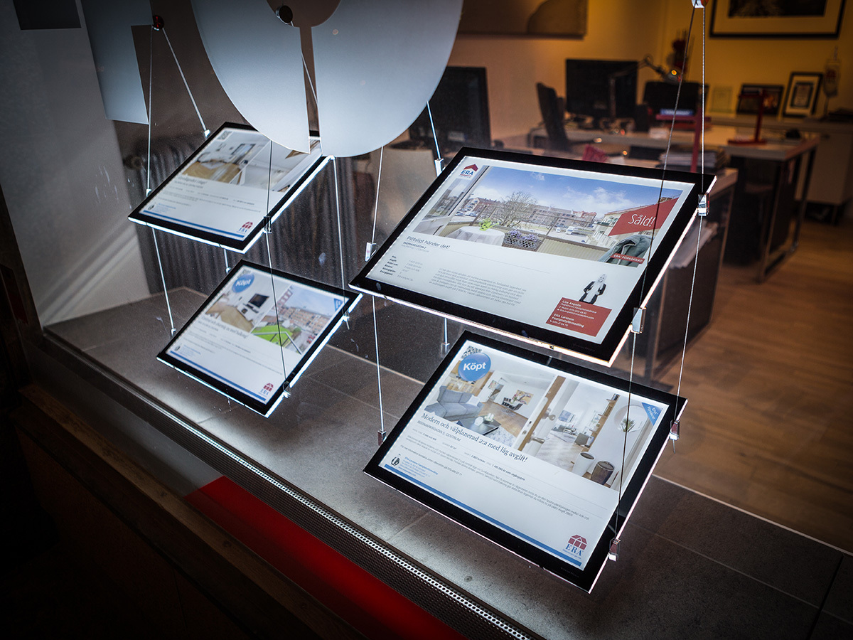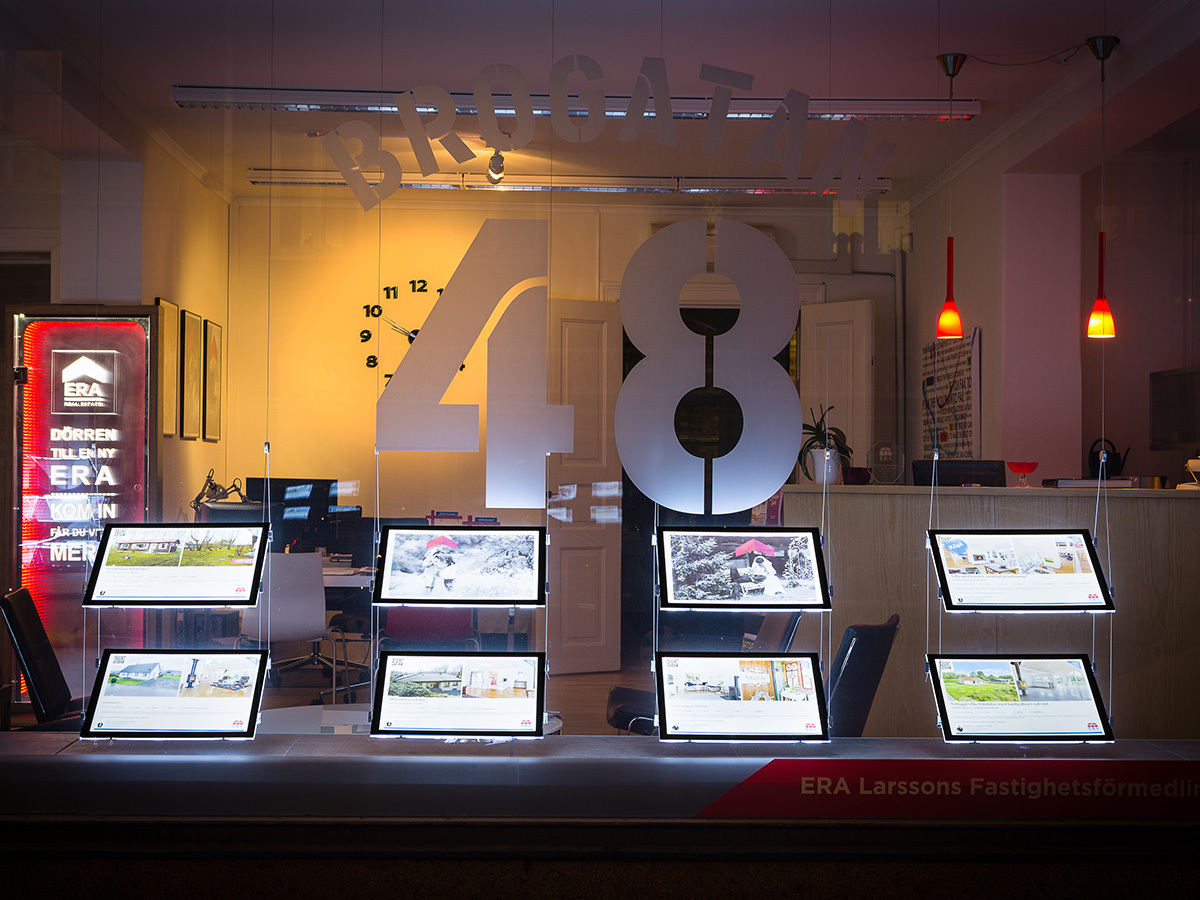 På Brogatan 48 i Halmstad ligger stans äldsta fastighetsförmedling som drivs av Leif Otterström. När den nya logotypen lanserades passade kontoret på att förnya sin fönsterskyltning. Med lokaler som har högt i tak och stora skyltfönster var det viktigt att bibehålla rymden i lokalen. Med 12st vinklade i MAX LED-fickor som fästes med wire i skenor i taket blev det en lysande skyltning som ser ut att sväva i luften. Ett stilrent och snyggt resultat!