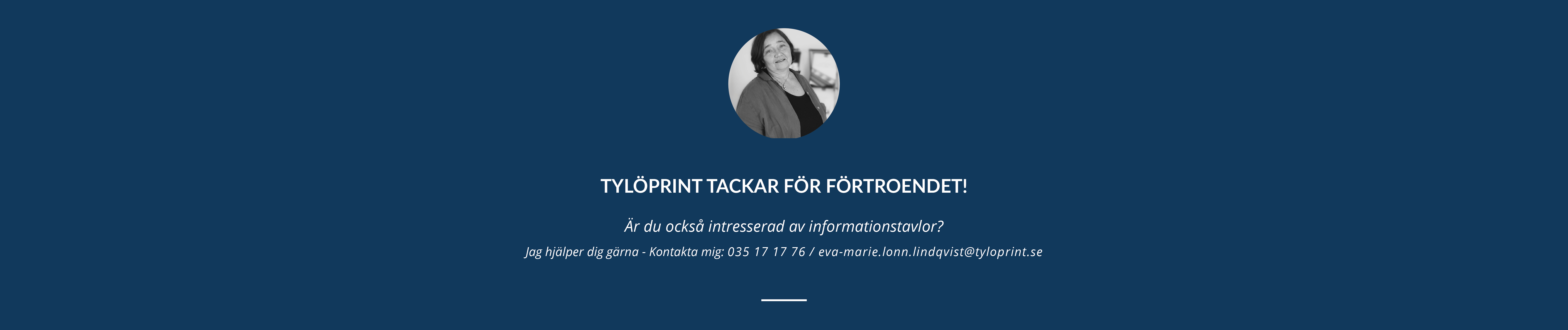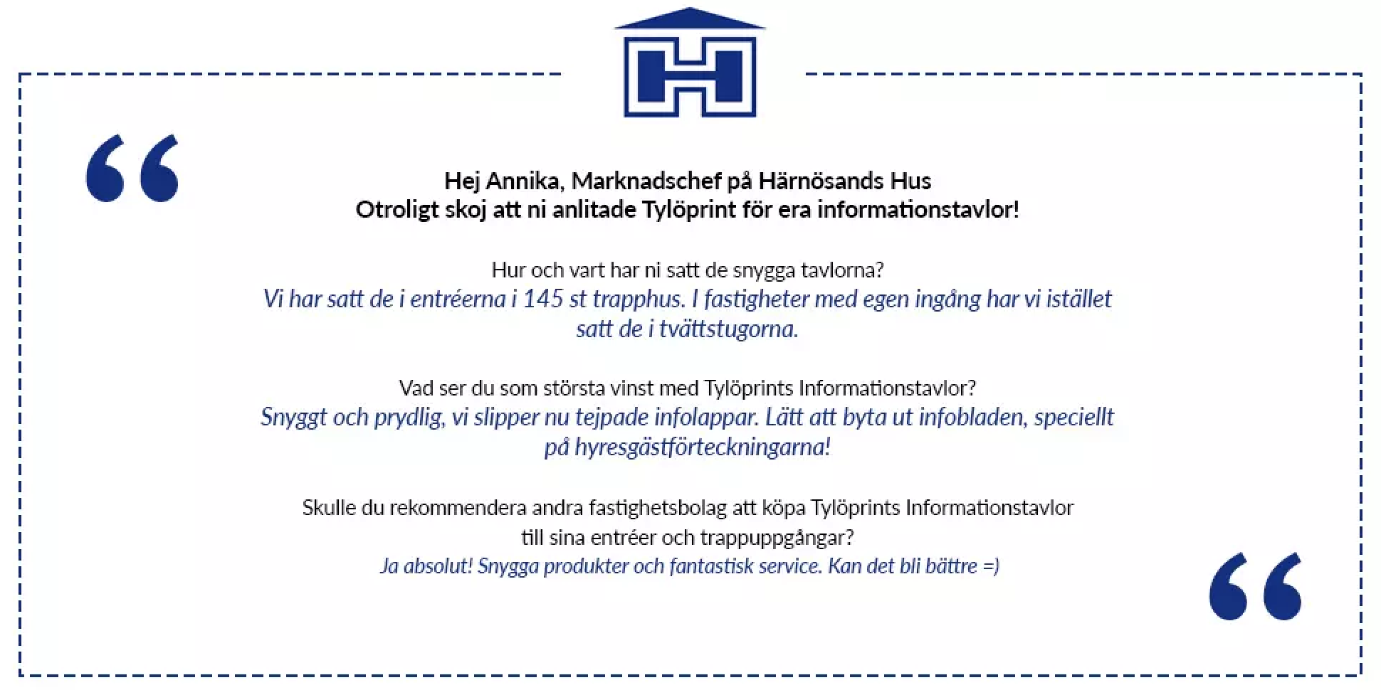 "Servicen var bra och jag kan absolut rekommendera andra fastighetsbolag att köpa informationstavlor från Tylöprint" - Annika, Marknadschef på Härnösands Hus.