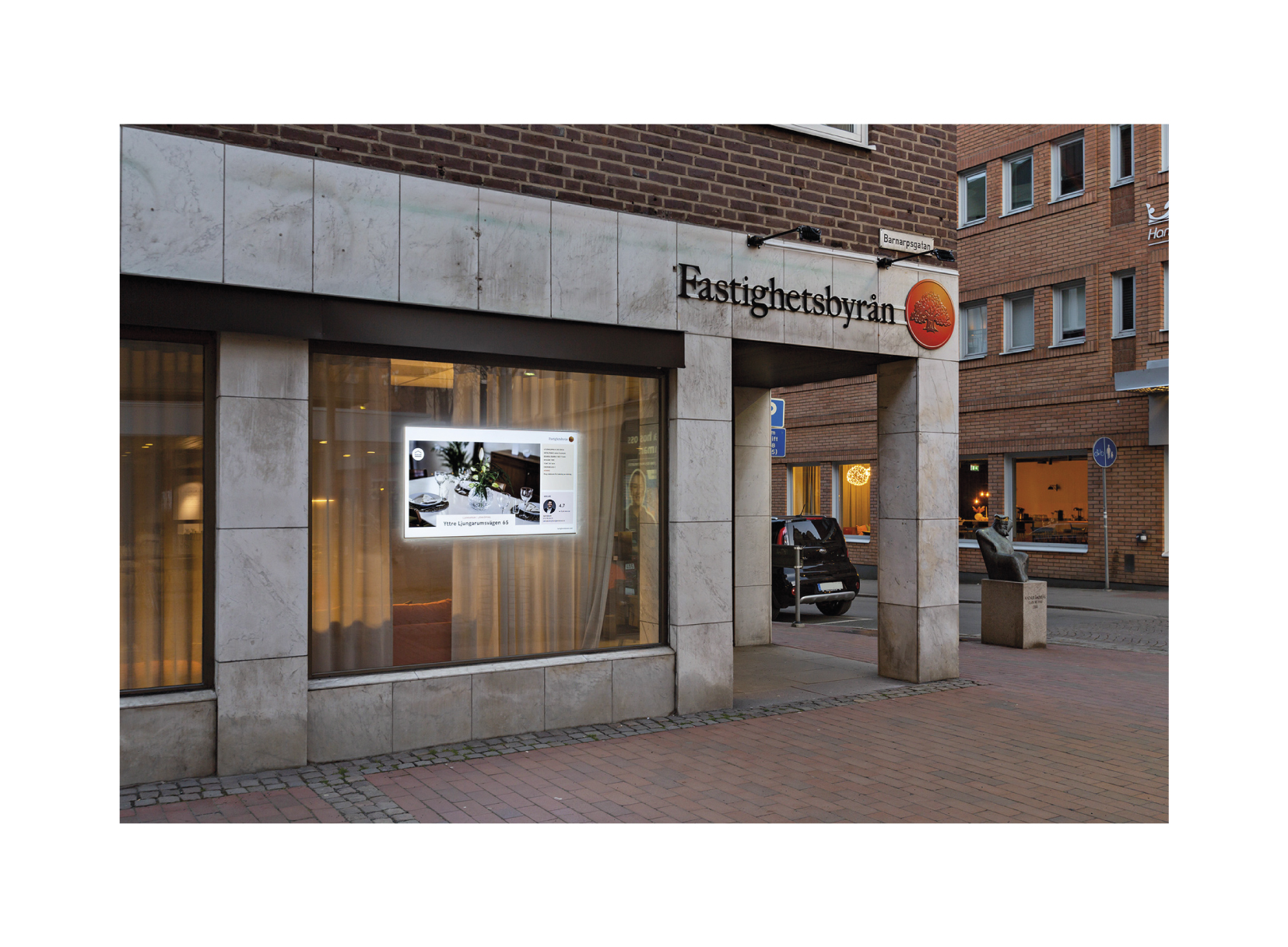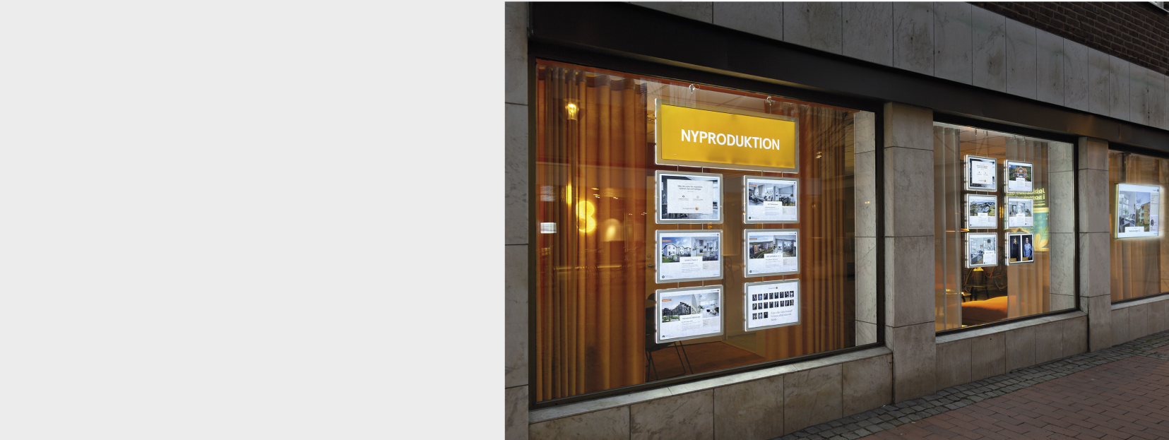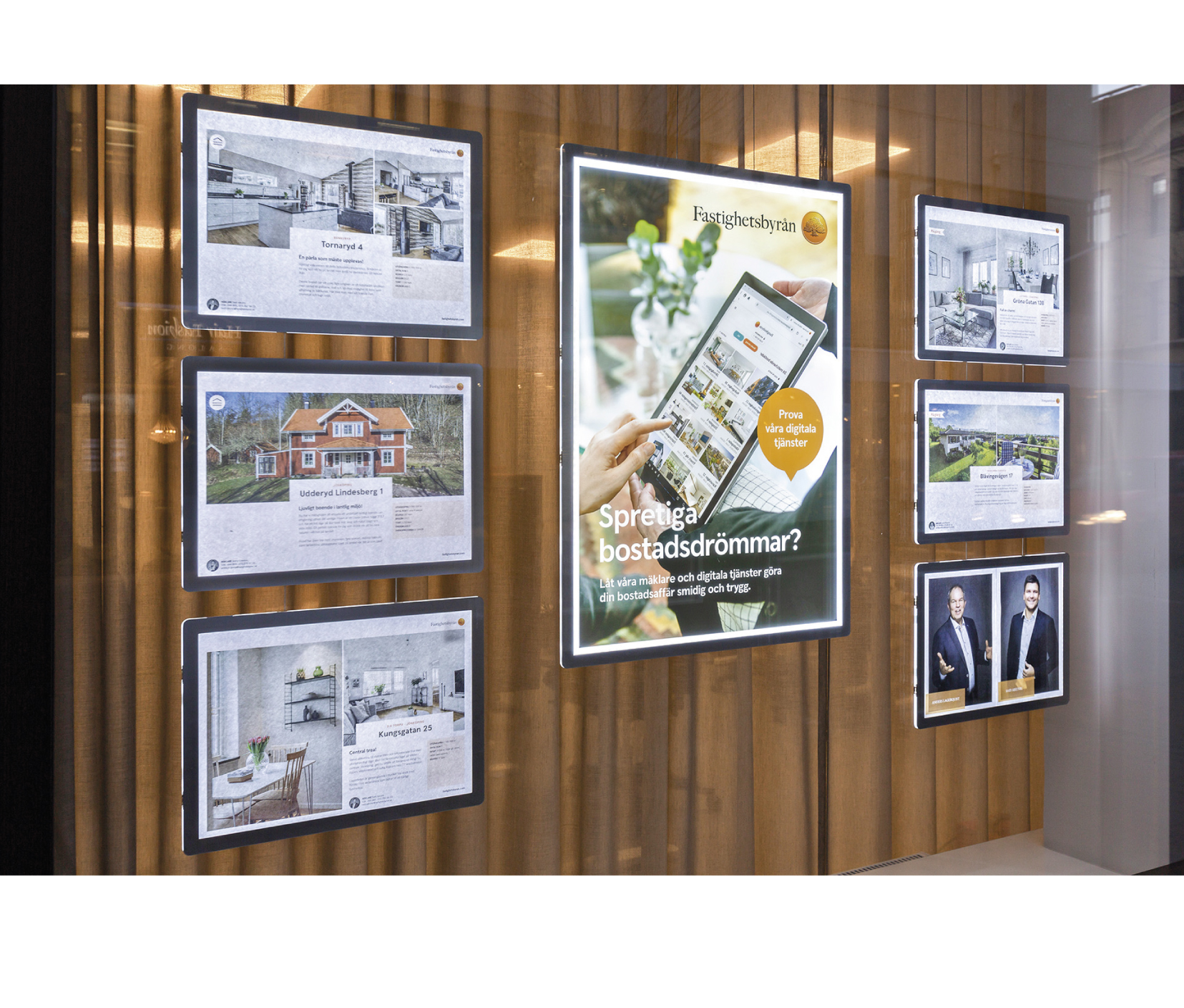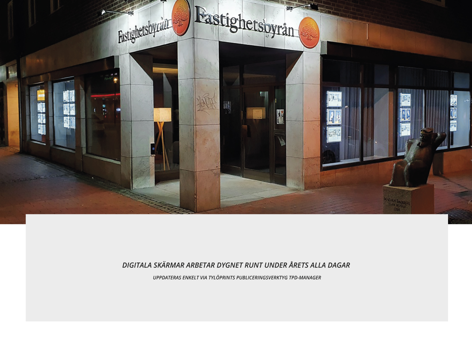 Valet föll på att komplettera upp med fler LED-skyltar samt att lägga till en stor digital skärm. Vårt digital signage mjukvara TPD-Manager kopplas mot mäklarnas affärssystem och laddar automatiskt upp nytt innehåll i skärmarna.
