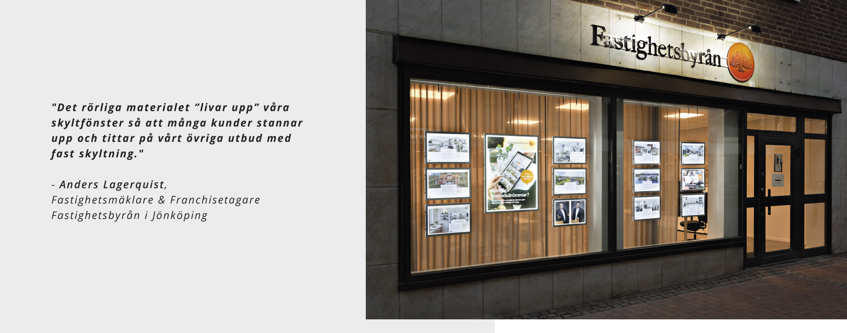 När Fastighetsbyrån i Jönköping skulle flytta in i nya lokaler kontaktade man oss på Tylöprint för att skissa på en snygg och praktisk fönsterskyltning. Lokalen är på hörnet till den välbesökta gatan så synligheten är optimal för kontoret.