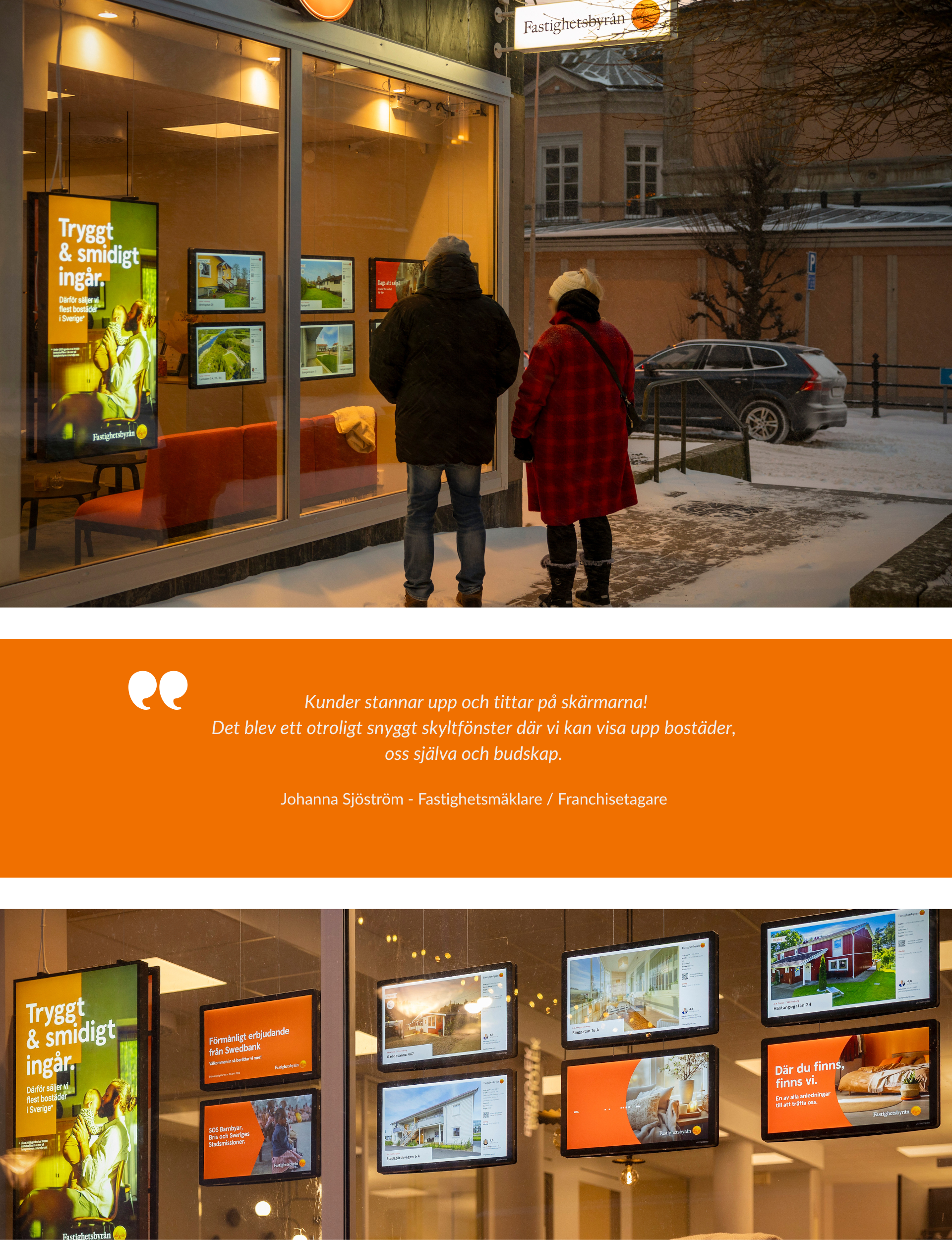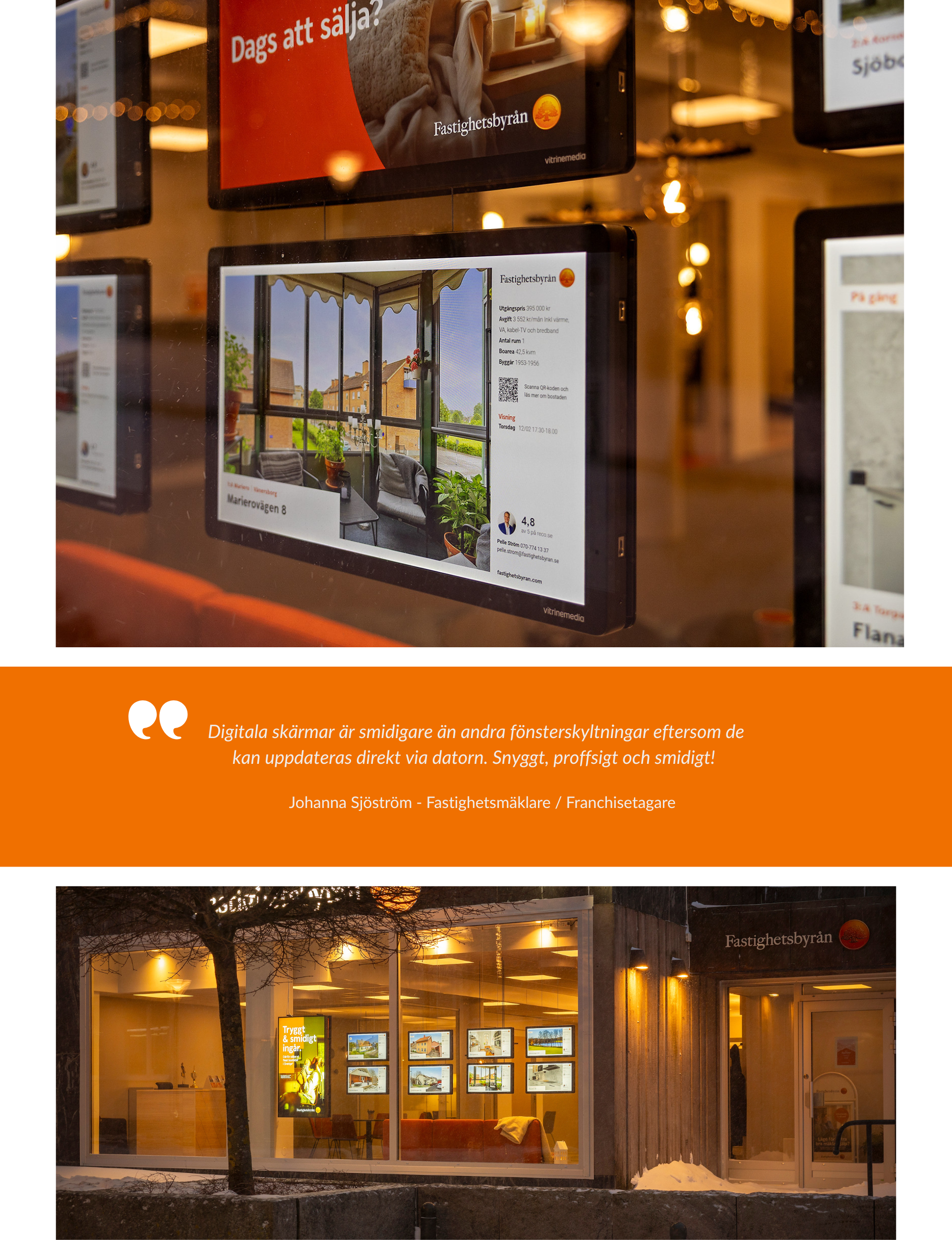 En viktig del i utvecklingen är digitala skyltar i skyltfönstret. Enligt kontorsägaren skapar de ett snyggt och levande skyltfönster där man enkelt kan visa upp bostäder, team och budskap. Skärmarna får människor att stanna upp, ta del av informationen och inspireras – vilket skapar stark och effektiv marknadsföring i det naturliga flödet utanför kontoret.