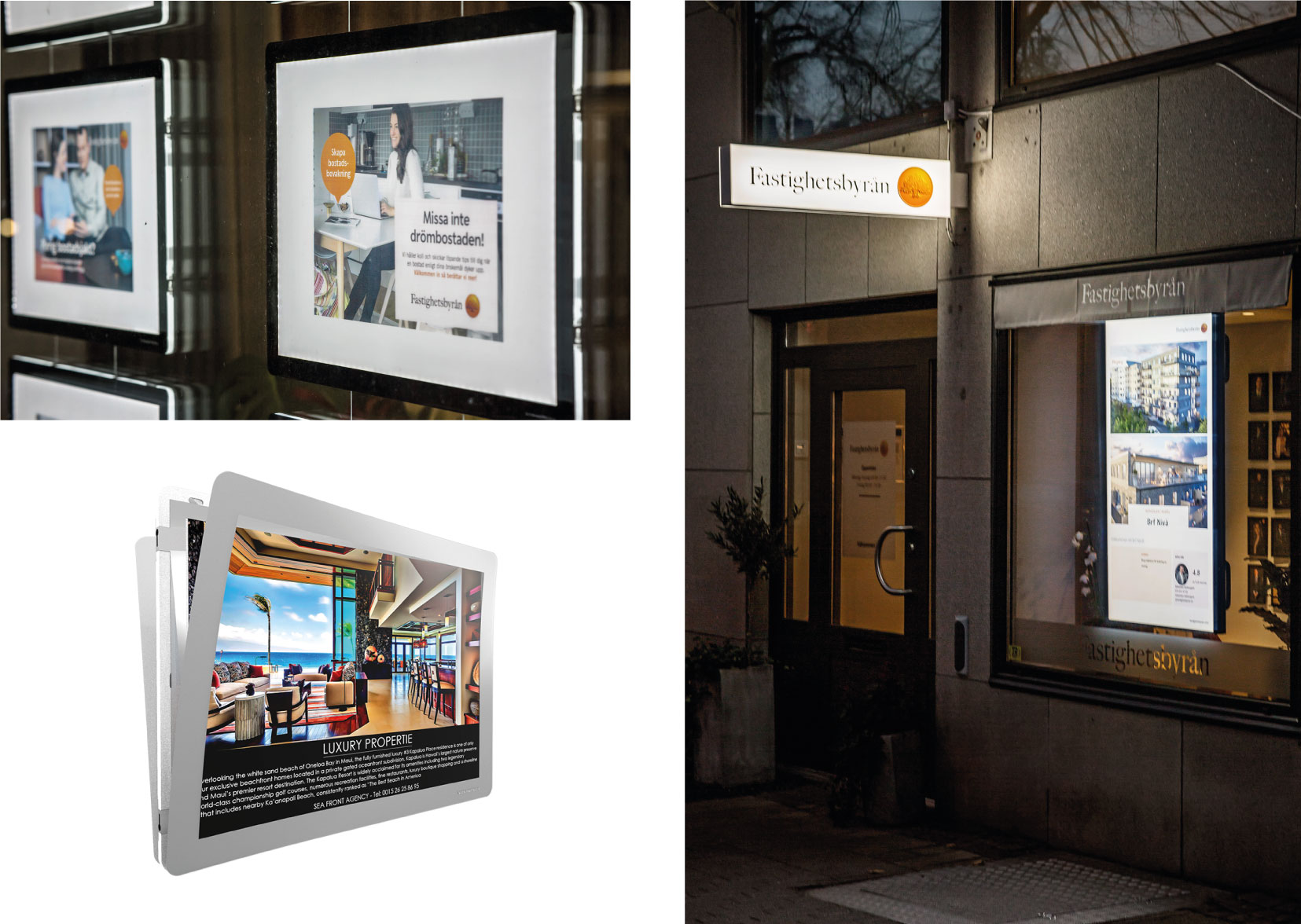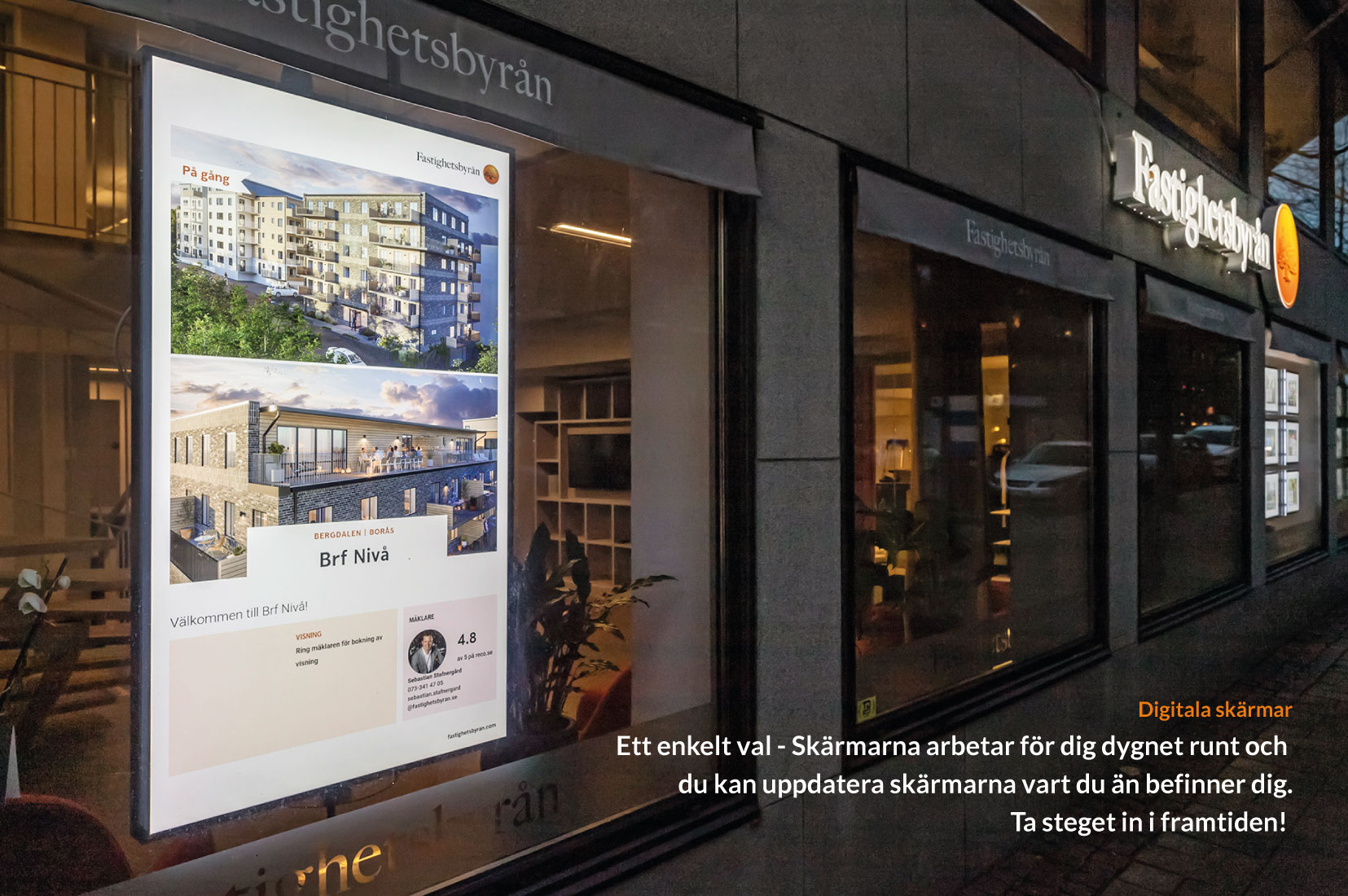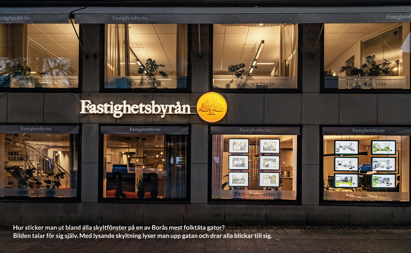 Att det skulle vara digitalt i fönstret var givet. En utveckling som går hand i hand med inte bara Fastighetsbyrån själva utan även hela Borås-andan. Traditionella LED-skyltar fyller upp fönstren och förser Borås stressiga gata med ljus. Hit, till dessa fönster dras blickarna. Hit riktas fokus. Innovation och tradition i perfekt harmoni.