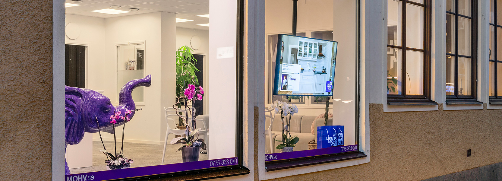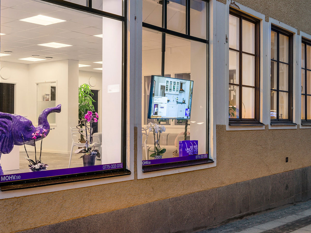 När Matilda Tengheden och Linus Thor drog igång nya kontoret i Norrtälje fick Tylöprint uppdraget att leverera digital skyltning till deras skyltfönster. På en 49-tums storbildsskärm skyltas objekt till salu ut mot förbipasserande på Stora Brogatan. Skärmen uppdateras enkelt genom TPD-Manager som är direkt sammankopplat med Vitec Express. Objekten och all information genereras till skärmen med bara ett par klick och uppdateringar kan genomföras blixtsnabbt oavsett var i världen man befinner sig.