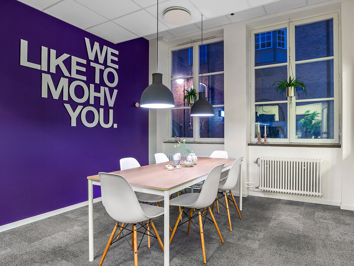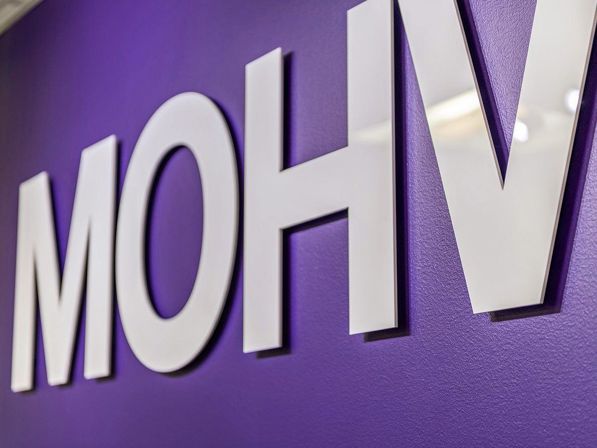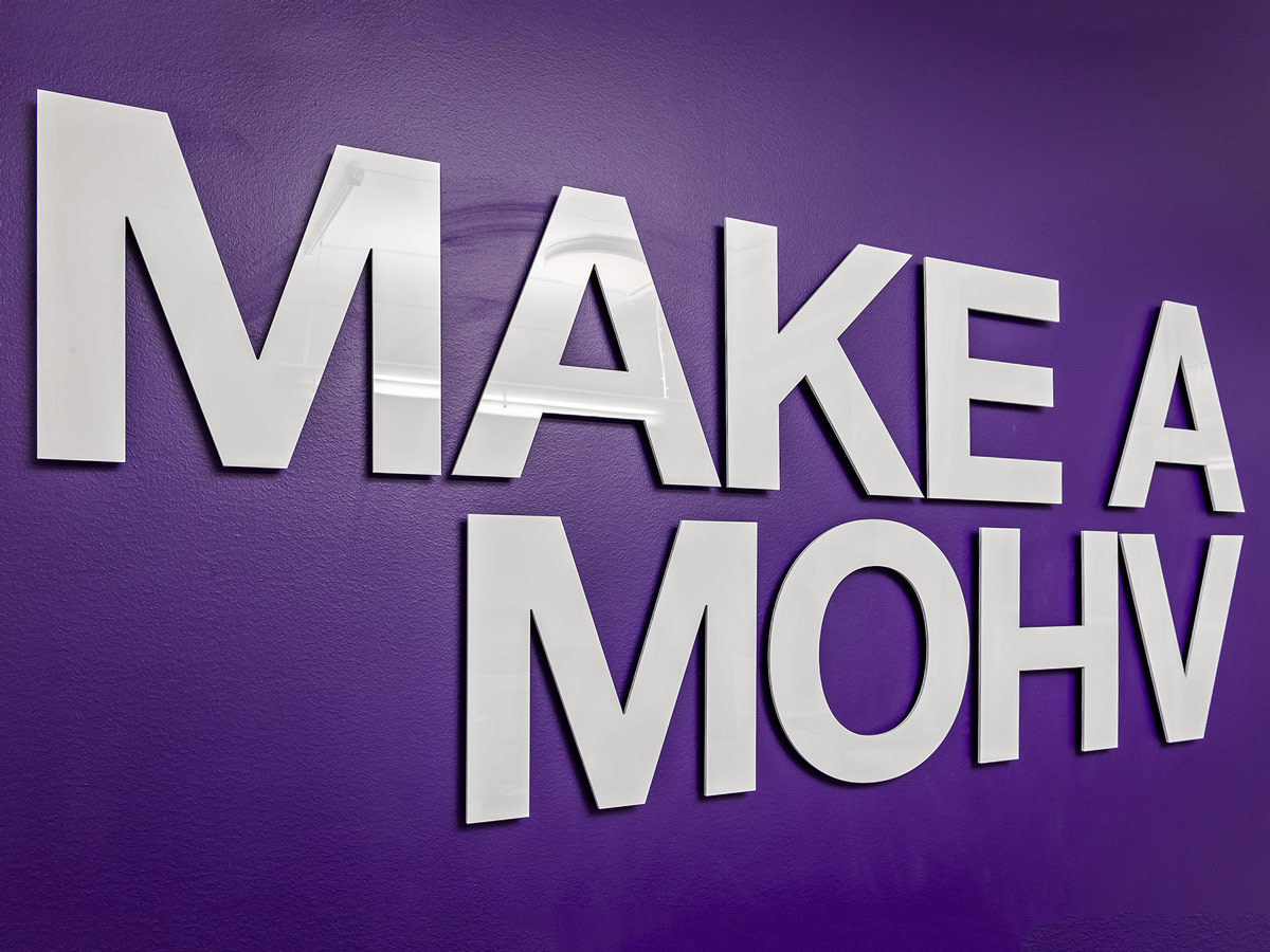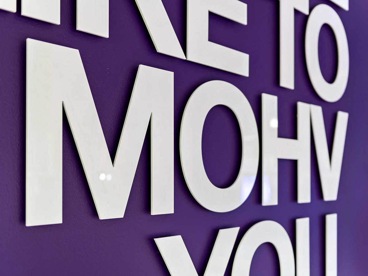 Tylöprint levererade även flera 3D-logotyper som pryder väggarna inne på kontoret. Den nästan 2 meter långa MOHV-logon samt budskapen "MAKE A MOHV" och WE LIKE TO MOHV YOU" är utskurna bokstav för bokstav i 5mm vit akryl och skapar en effektfull känsla när man stiger innanför dörrarna på kontoret.