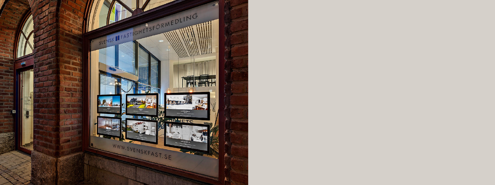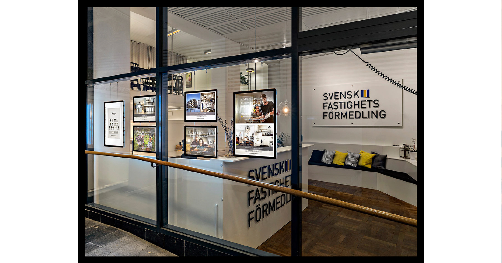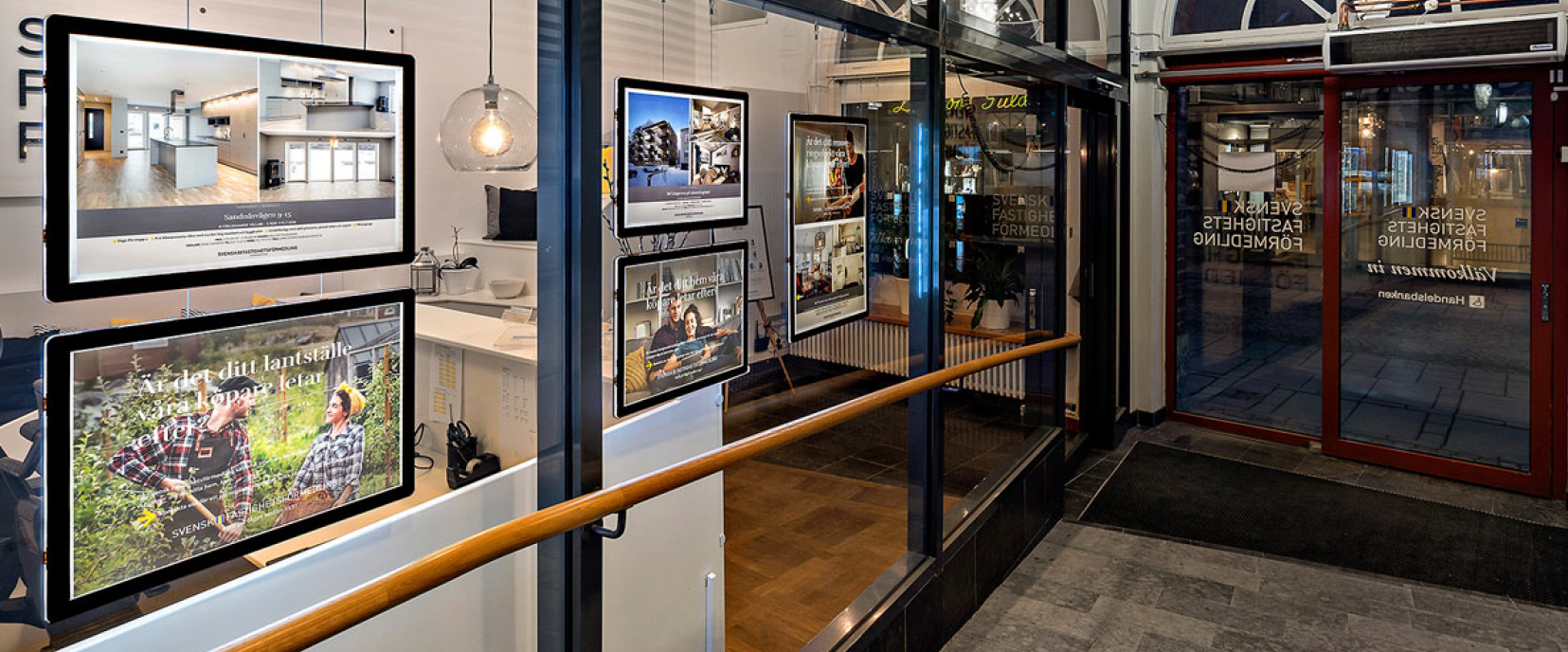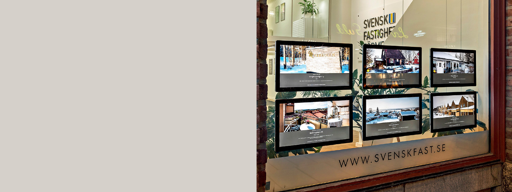När Svensk Fastighetsförmedling i Östersund tog kontakt med Max Nilsson på Tylöprint hade de under många år använt ett traditionellt wire-system för objektsskyltning i sina skyltföns- ter. Nu var det dags att ta steget in i framtiden och digitalisera skyltningen. Wire-system byttes ut mot 6 stycken digitala Light & Play-skärmar samt 6 stycken VM-TWO LED-fickor i formaten A3 och A2.