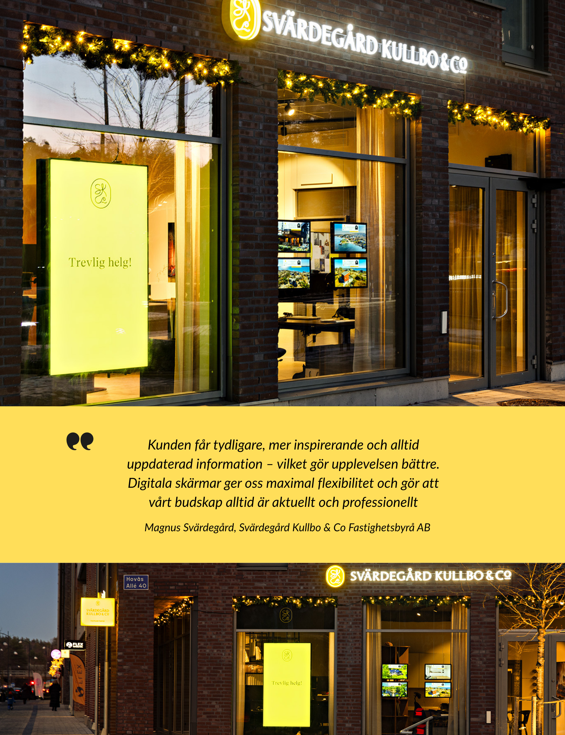 Den större digitala skärmen är på mäktiga 75” och då vägen utanför är hårt trafikerad blir det lätt att skapa nyfikenhet och förmedla sina budskap. De ”mindre” Light & Play förmedlar information om objekt till salu både snyggt, smidigt och enkelt. Stora skärmen har även försetts med ett bakstycke som lyser upp logotypen. Supersnyggt, inte bara ut mot gatan utan även in i lokalen.