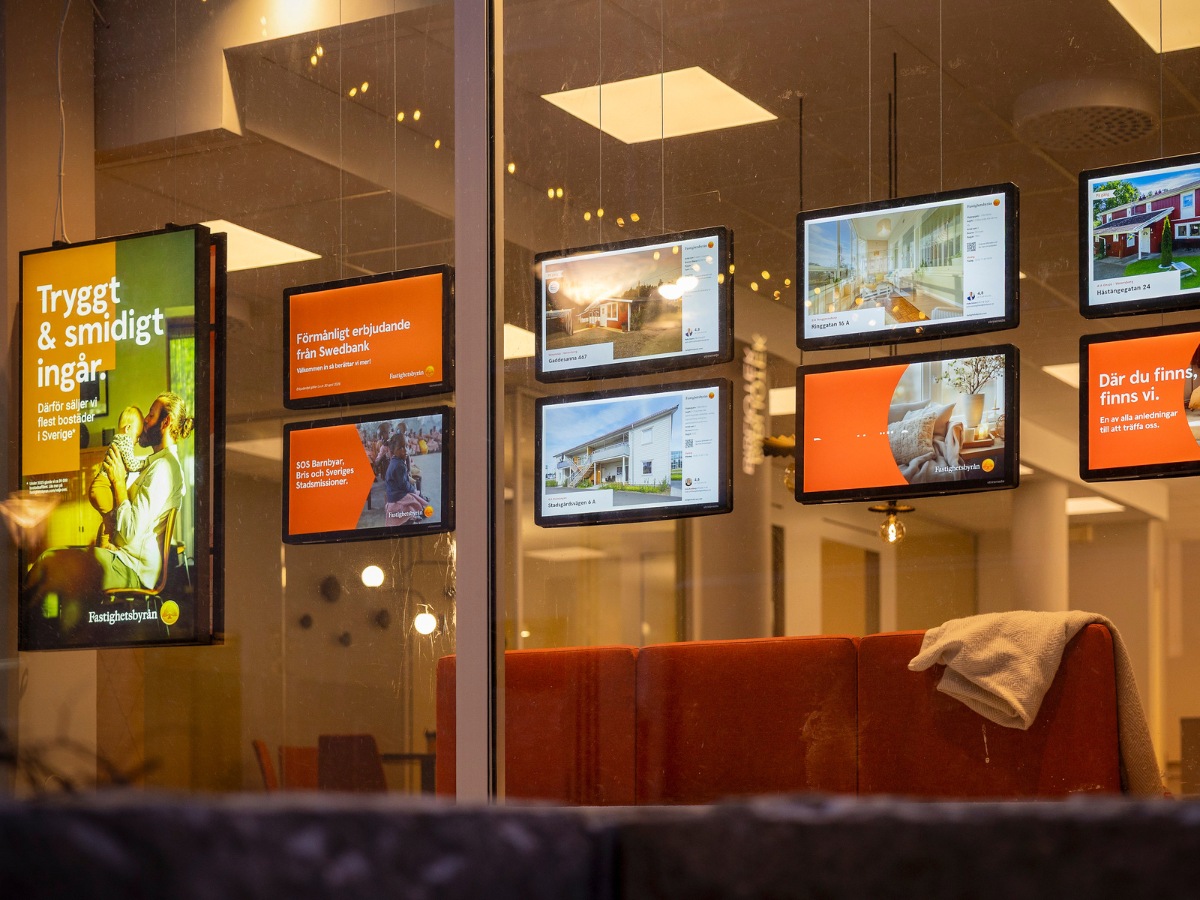 Våra storformatsskärmar är utvecklade för att få människor att stanna upp. För mäklarkontor i centrala lägen är detta ett effektivt sätt att fånga intresset för både bostäder och varumärke.